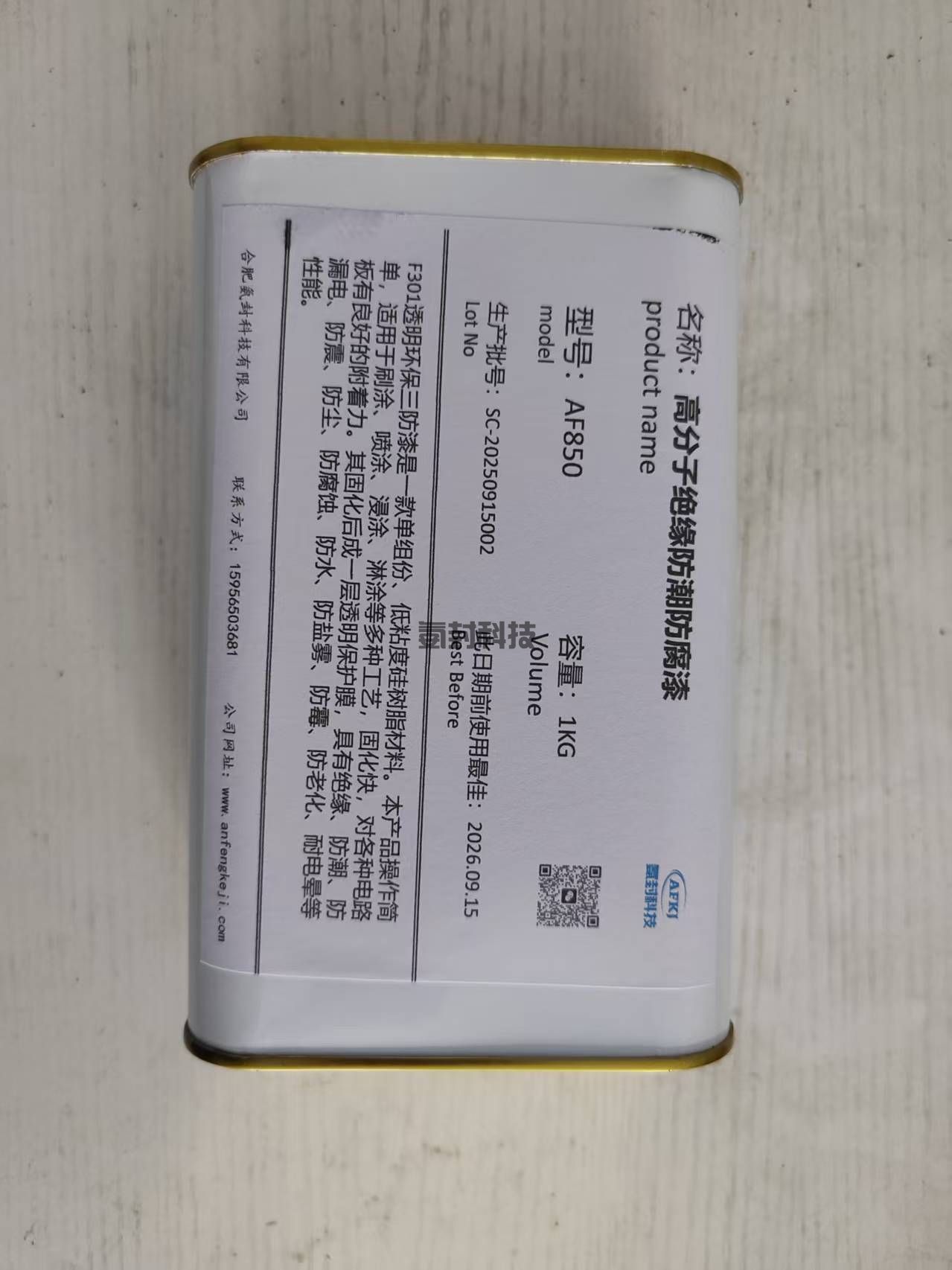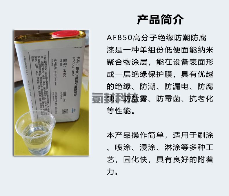 产品信息:【品牌】: 氨封AFKJ【名称】: 高分子绝缘防潮防腐漆【型号】: AF850【用途】: 绝缘、防潮、防凝露、防腐蚀、防盐雾、防霉菌、抗老化等性能【重